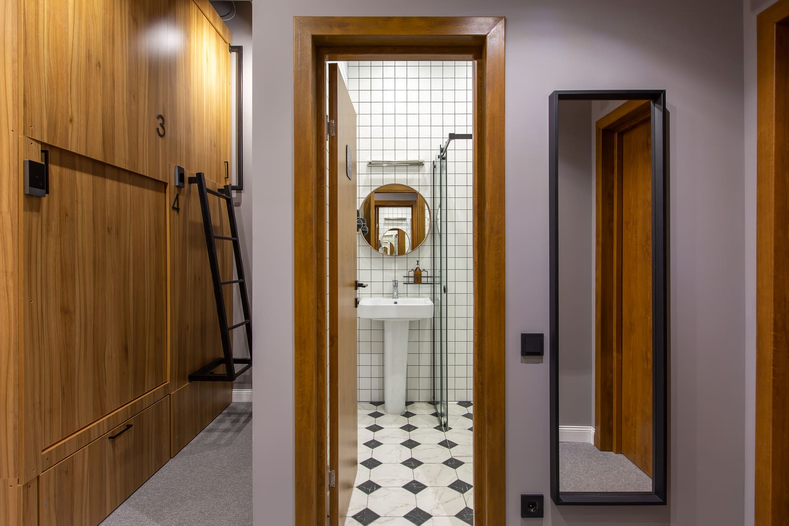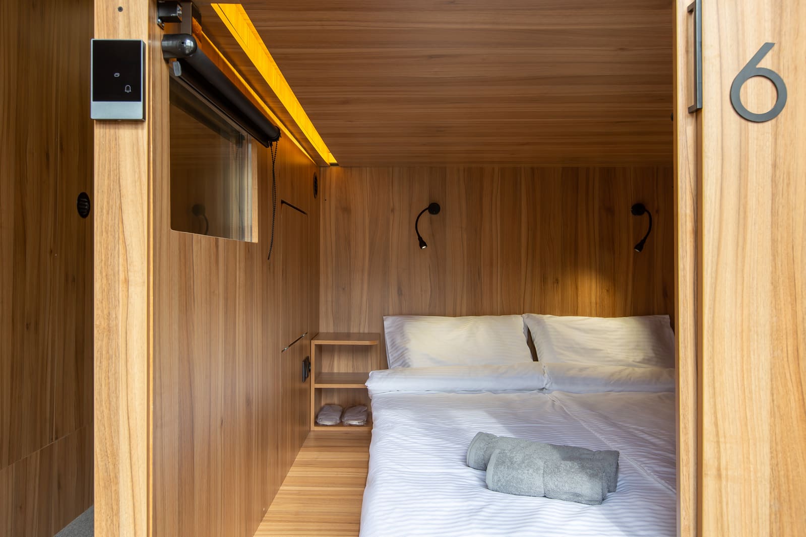 Комфортабельные и просторные капсулы из натуральных материалов оснащены комодом для багажа с контейнером для обуви, откидным столиком, индивидуальной системой вентиляции, светильником для чтения книг, основным светильником и розеткой. Доступ в капсулы и в комод по индивидуальным кодам – 100% безопасность и сохранность ваших вещей. Ванная и туалет в каждом блоке.