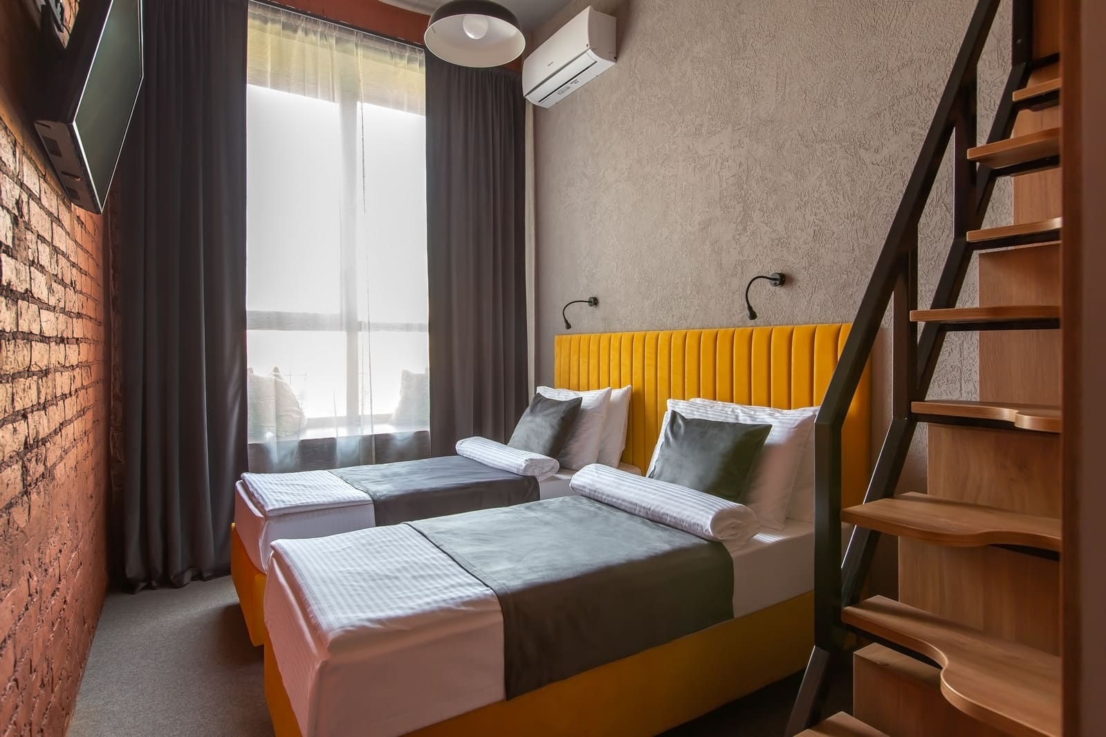 Комфортабельные двухуровневые номера идеально подойдут для размещения семьи или компании друзей до 4 человек. Площадь номера составляет 16 кв. м. К вашим услугам в номере: телевизор, ванная комната с душевой кабиной и санузлом, косметические принадлежности, полотенца, фен, высокоскоростной Wi-Fi.