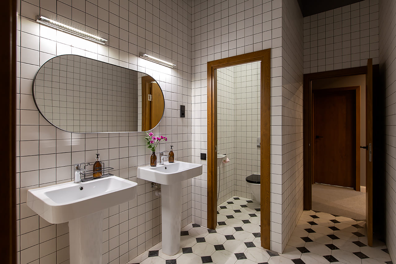 Украшением и гордостью Q-block служит найденная во время ремонта метлахская плитка начала 20 века. С помощью профессионалов проведена полная реставрация плитки.
